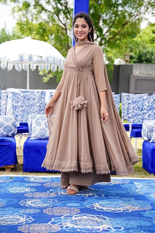 4. ESTela Women’s Solid Lace Work Anarkali Kurta Palazzo Dupatta Set